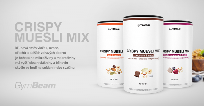 Crispy Muesli Mix je směs tvořená ovesnými vločkami, ovocem, oříšky a dalšími křupavými dobrotami, které skvěle chutnají s mlékem či jogurtem, uzobávat se však dají i samostatně. Při výrobě byly použity ty nejkvalitnější ingredience, a tak můžete mít dobrý pocit, že jste tělu dodali potřebné živiny.